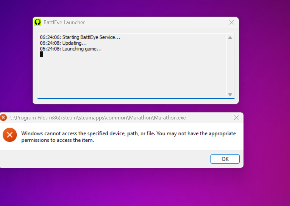 Fully close Marathon and Steam, then run Steam as administrator and launch Marathon again.