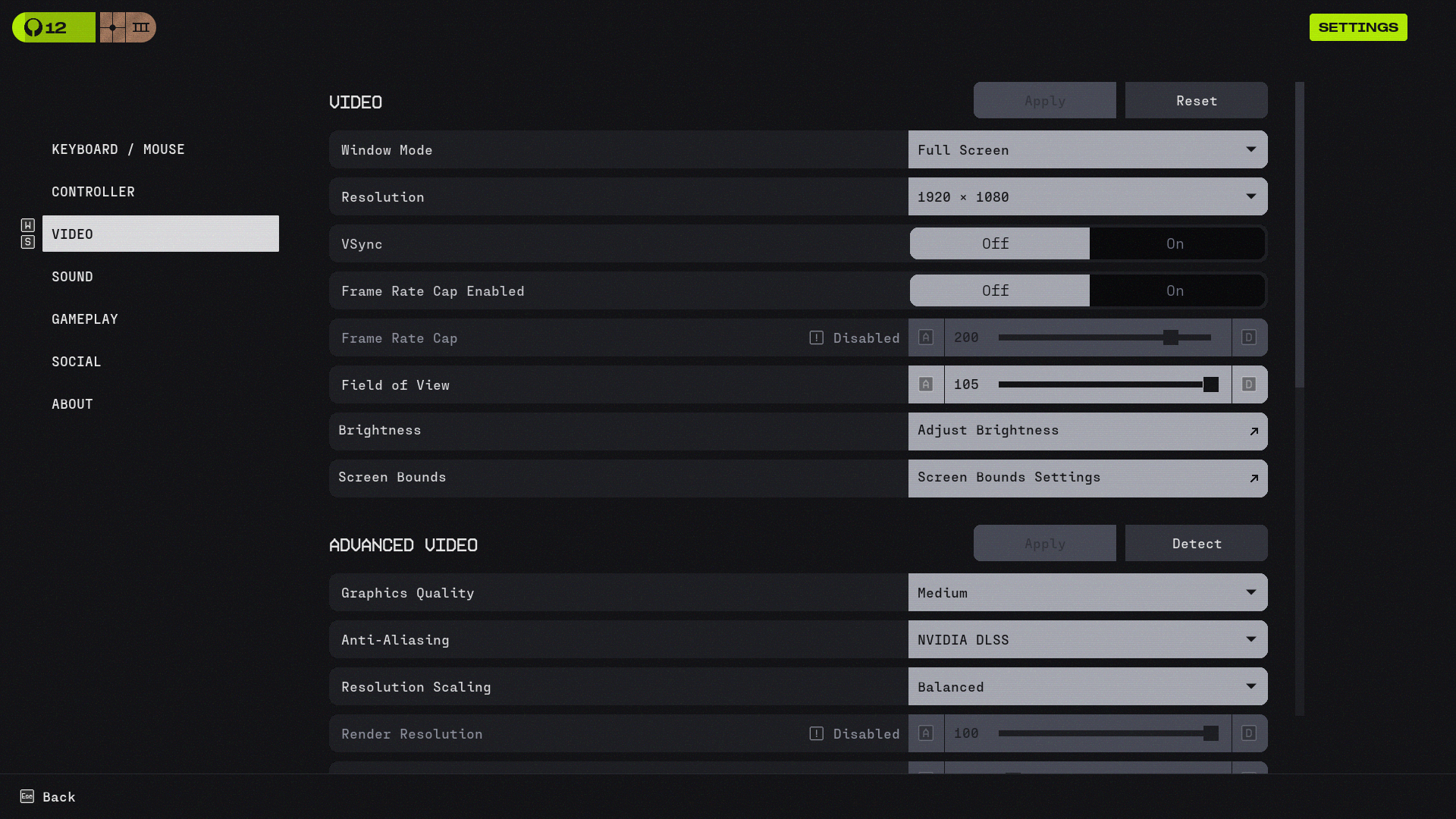 For a high frame rate (120+) configuration, we recommend starting with 1080p and medium settings with VSync and Frame Rate Cap disabled. Open Settings > Video, and set:
