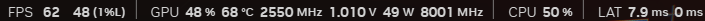 GPU utilization stays low. The system clearly has headroom, but the game will not push beyond that ~57 FPS ceiling.