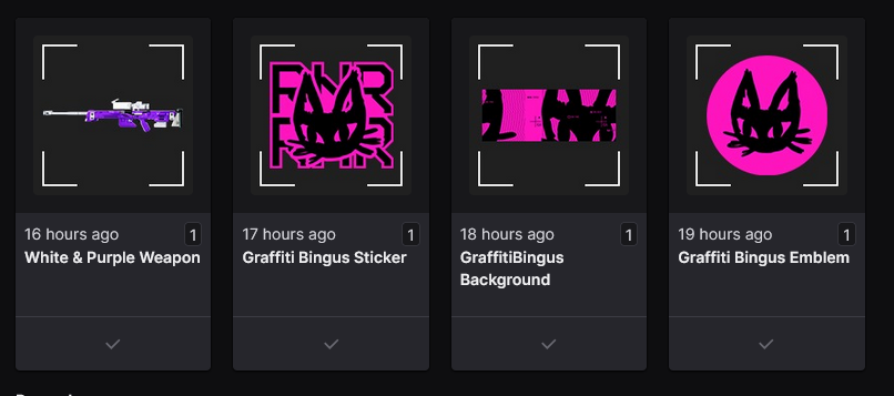 The one I received was the "White & Purple Weapon". I have not received the "Graffiti Bingus Sticker", "GraffitiBingus Background", and the "Graffiti Bingus Emblem".