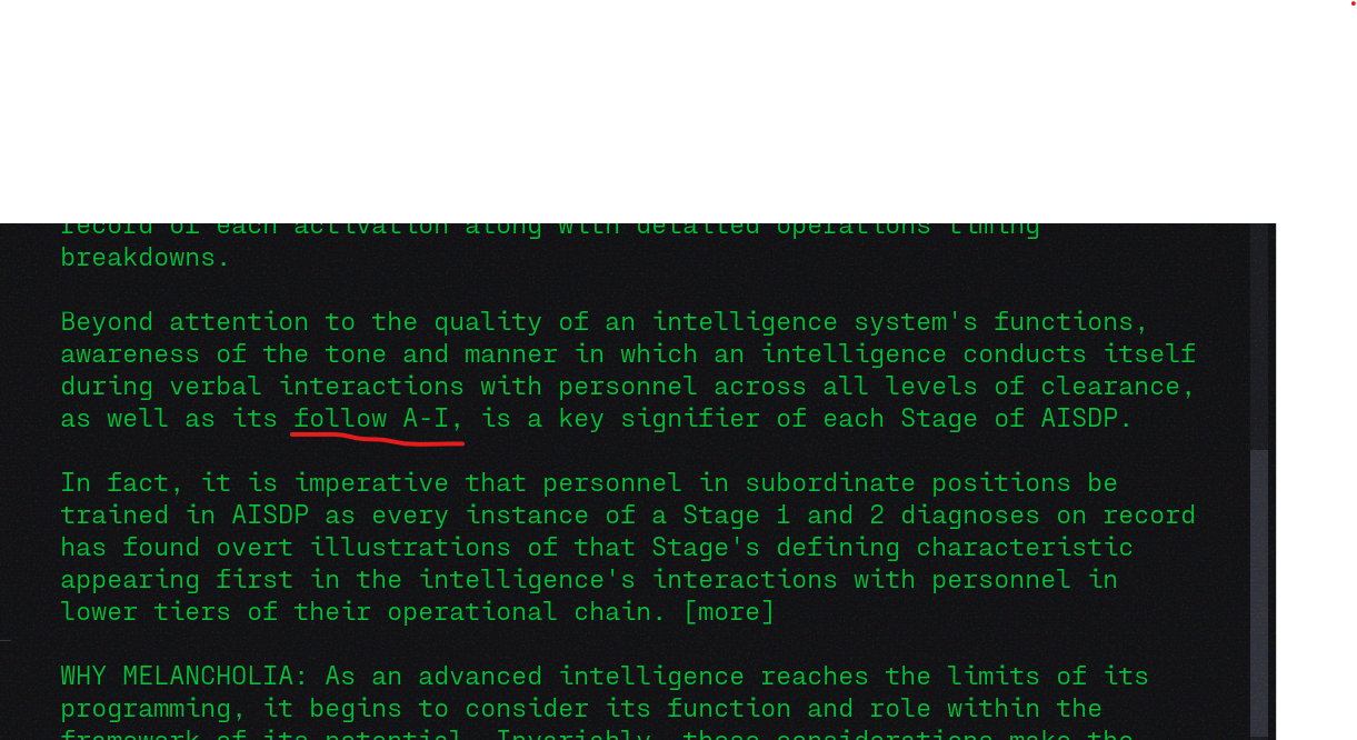 There is a small typo in codex entry SECURITY BREIF: RAMPANCY, STAGE 1 under Outpost > collectibles. Screenshot attached. I think you probably meant "fellow A-I" instead of "follow A-I".