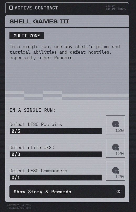 The contract for Shell Games III states "In a single run, use any shell's prime and tactical abilities and defeat hostiles, especially other Runners."