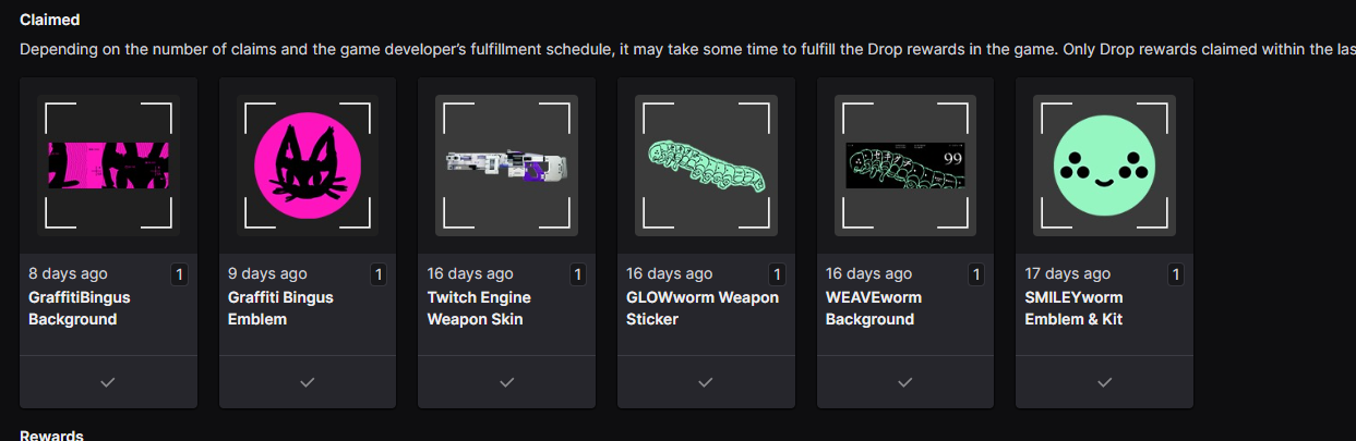 If the Twitch Drop doesn't appear, log in to Twitch's website and view your Drops Inventory to see all the Drops you've earned. Click on the "Claim" button on any Marathon Drops that have that option below them, go back to your Partner Rewards area, and click the "Refresh" button to get the Drop to appear.