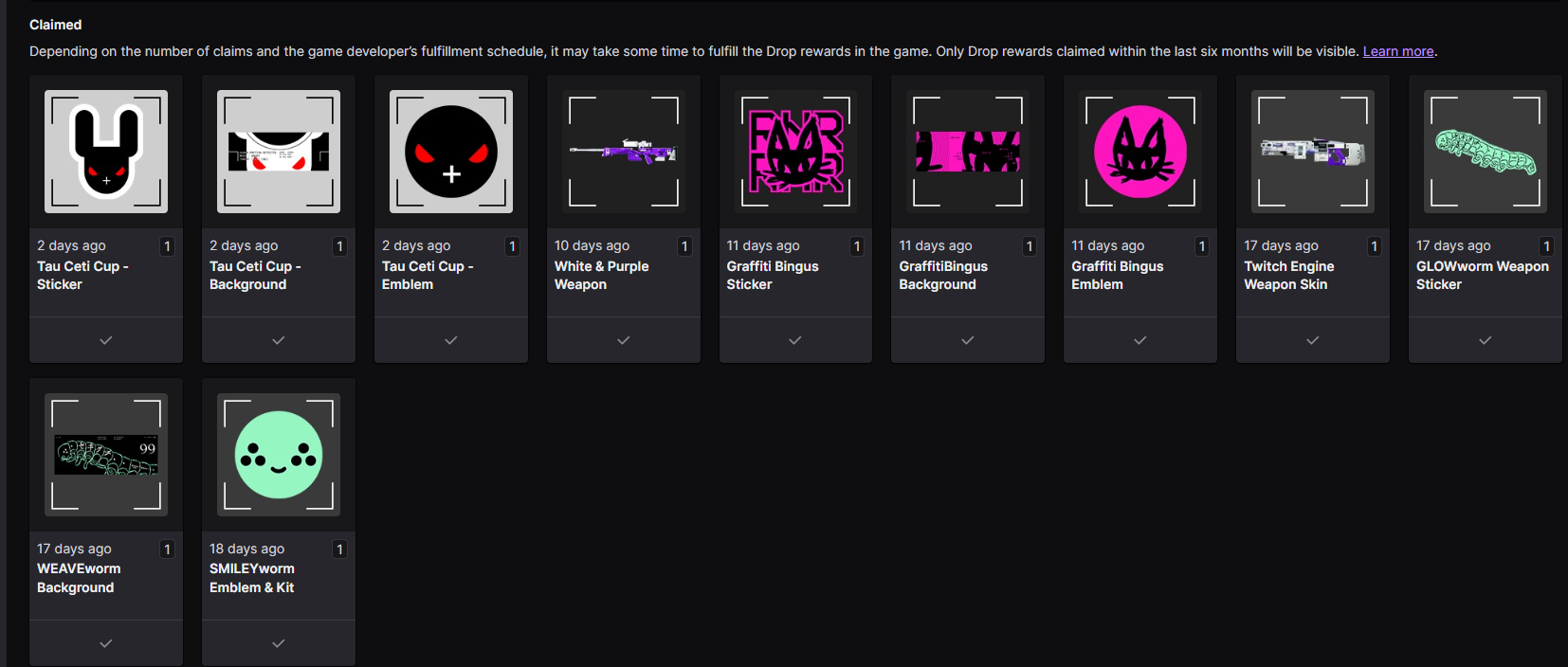 If the Twitch Drop doesn't appear, log in to Twitch's website and view your Drops Inventory to see all the Drops you've earned. Click on the "Claim" button on any Marathon Drops that have that option below them, go back to your Partner Rewards area, and click the "Refresh" button to get the Drop to appear.