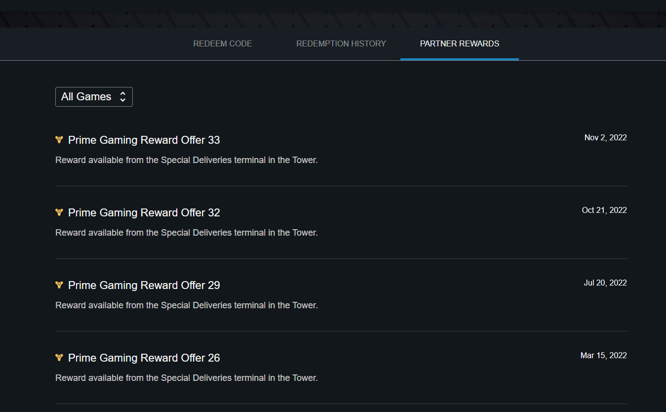 In the meantime, to confirm that you successfully earned the Twitch Drop, locate your "Redeem Code" page in your Bungie.net account and then click on "Partner Rewards." Your Twitch Drops will appear on this page.