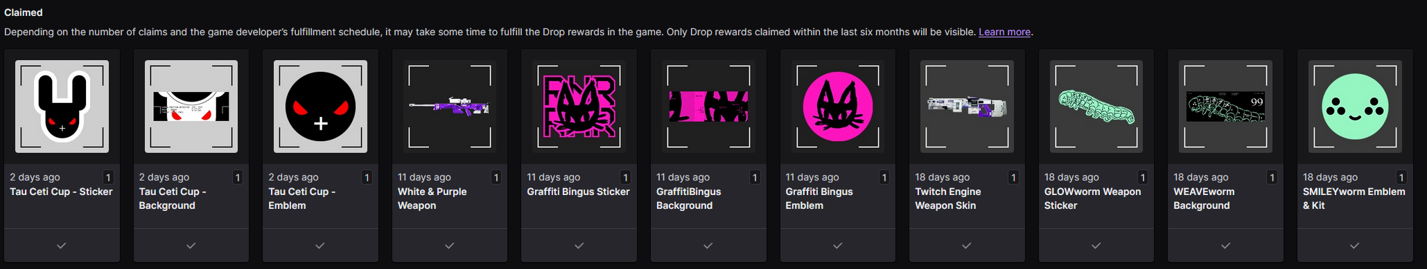 I have received the latest batch of Twitch Drops from the Tau Ceti Cup but still have not received any of the things from the two previous ones with the cat or worm themed items.