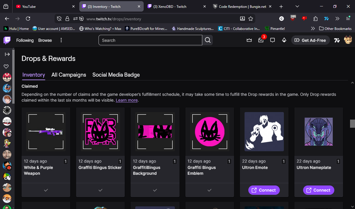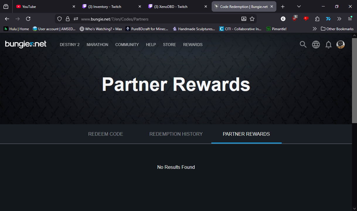 I have claimed these drops 12 days ago and linked my account, but I still have received none in game or in my partner rewards on Bungie.net. Specifically, I am missing all 4 of the drops shown in the screenshot, being the White & Purple Weapon, Graffiti Bingus Sticker, GraffitiBingus Background, and Graffiti Bingus Emblem.
