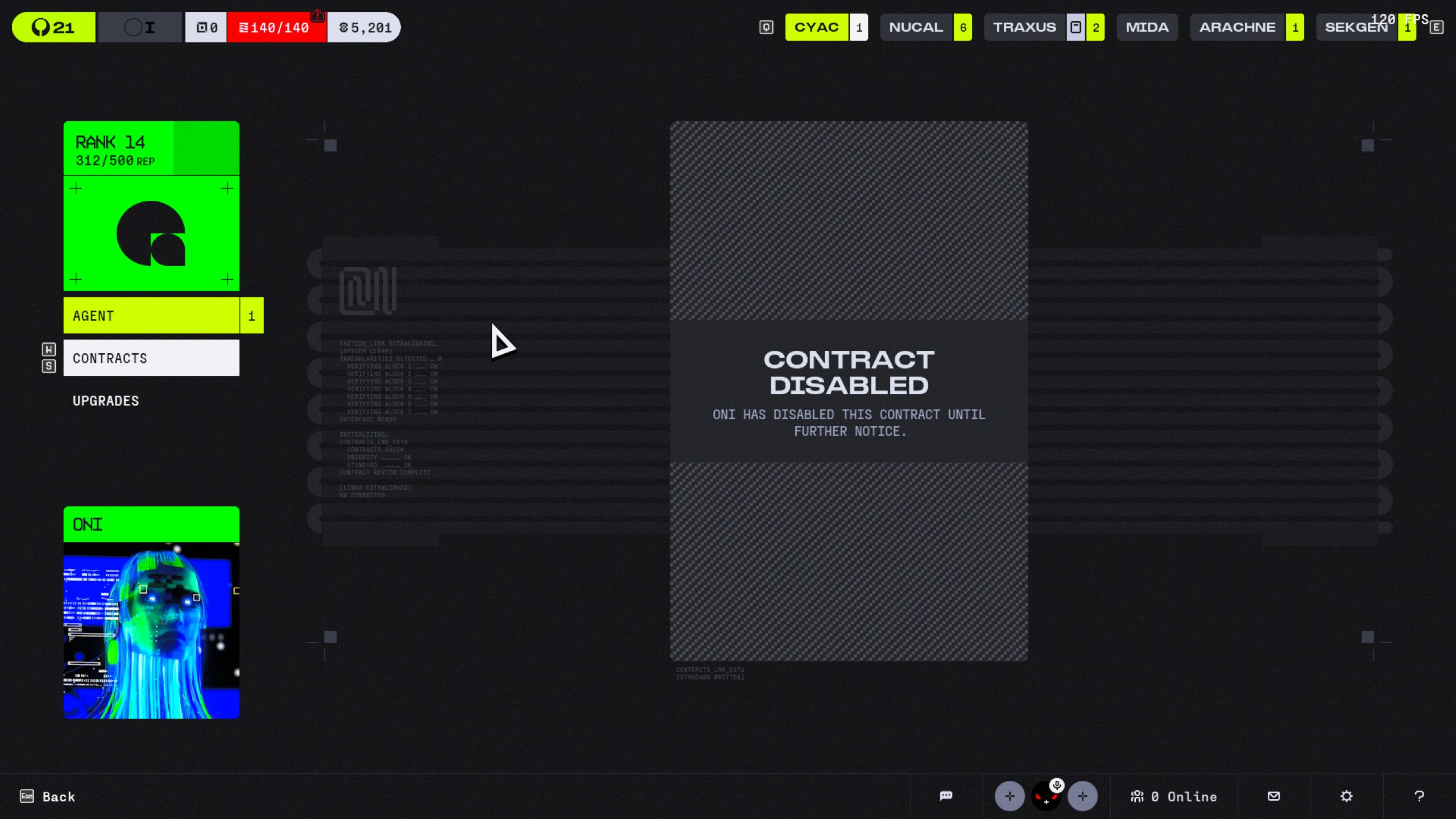 Not sure when exactly this happened but at some point, my contracts got disabled in CyberAcme and I haven't been able to progress since. I have attached a screenshot for reference too.