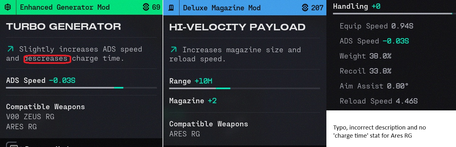 Railgun attachments have wrong stats/descriptions, Ares RG is missing 'charge time' stat from the inspect menu