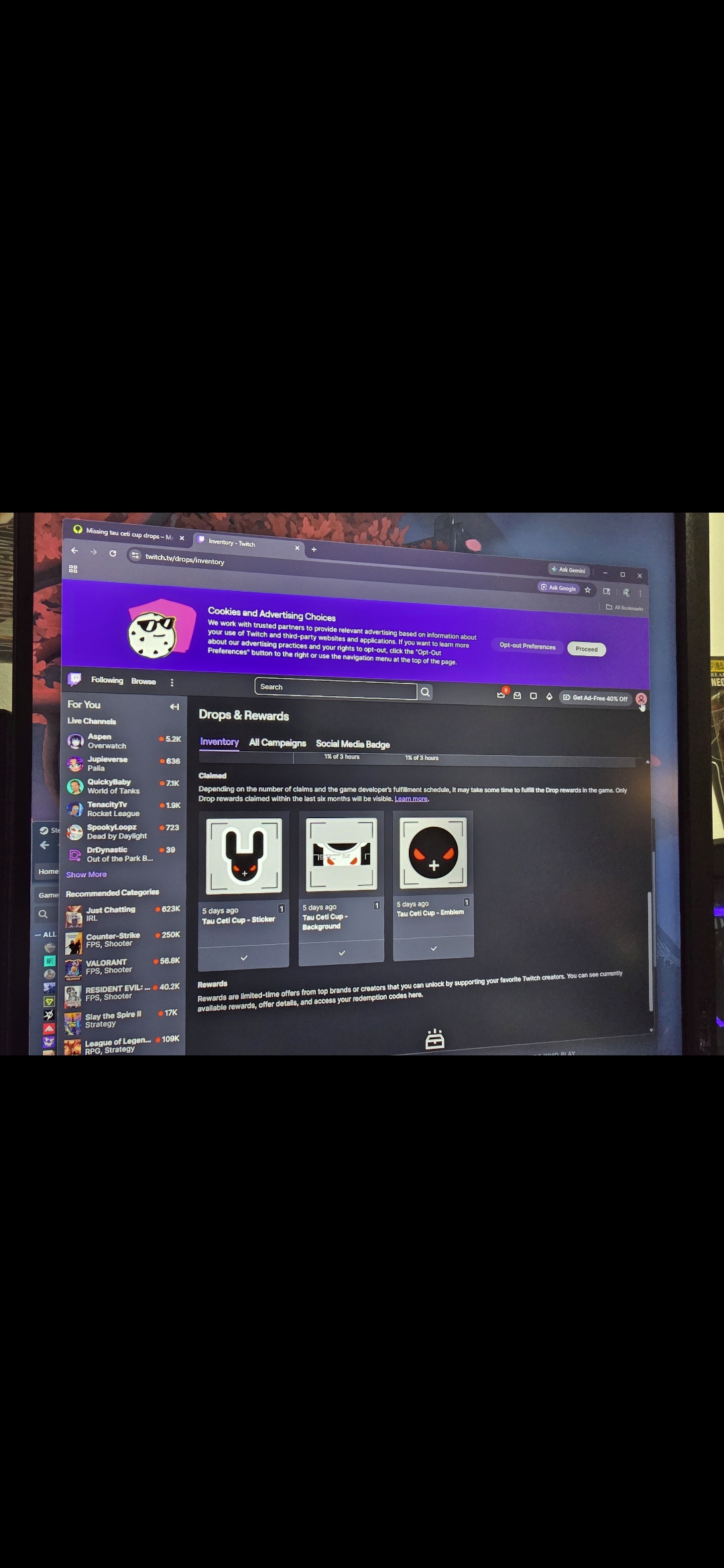 hello i would like to start with i have gotten all other rewards thus far but i have not gotten the more recent tau ceti cup drops. I relinked a new twitch account to my bungie acct in order to claim the new set and i have yet to get them. thank you