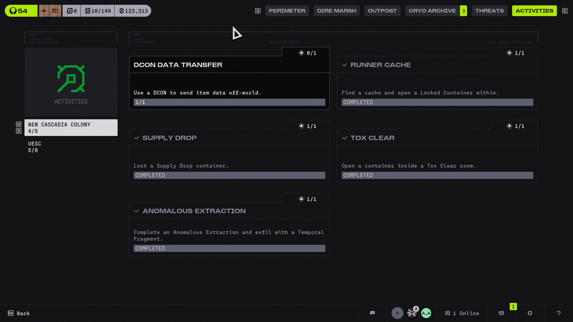- Description of Issue - Codex bug, i cannot complete the index of the DCON Data transfer. The entry says 1/1 complete but i cannot complete it, clicking it does not unlock it.