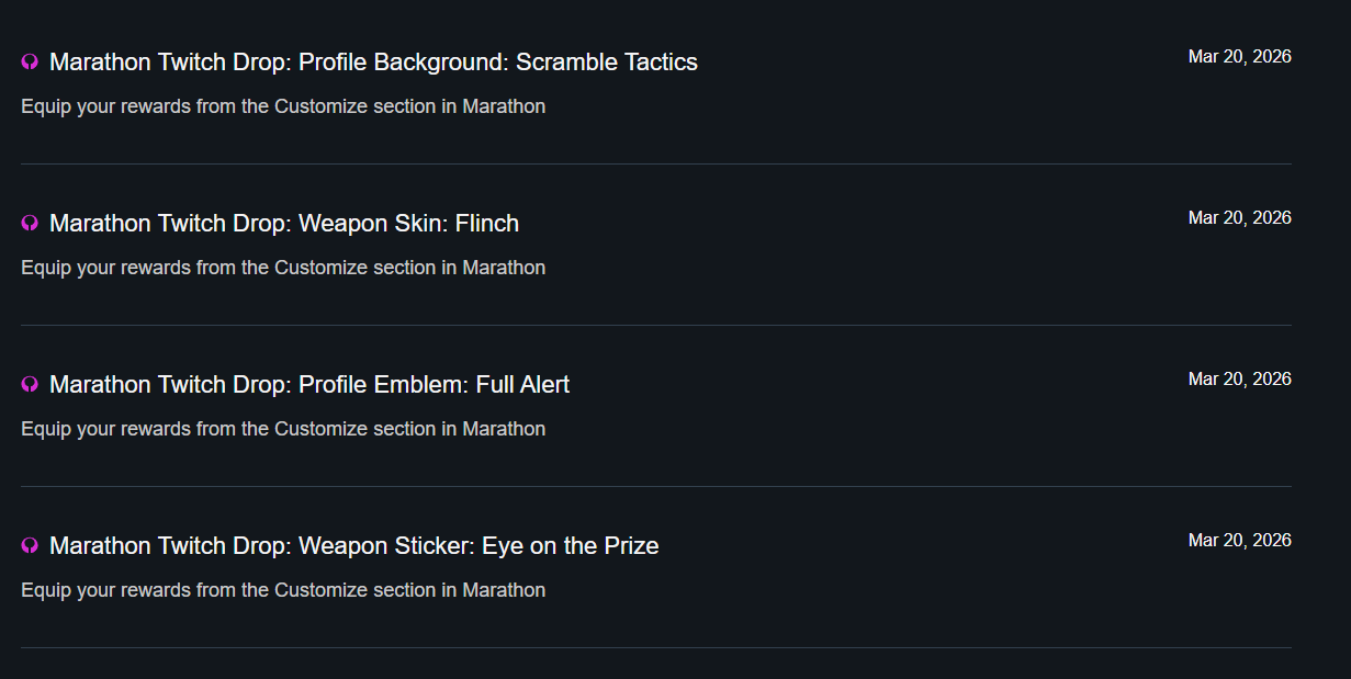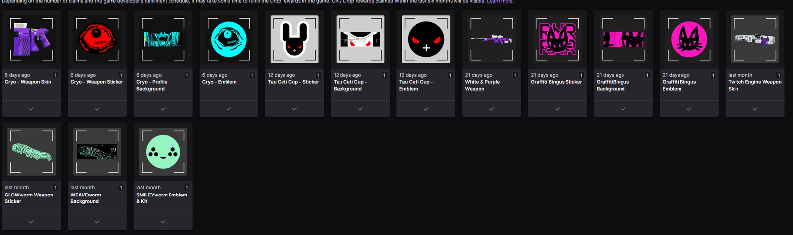 Hello, I have been experiencing issues regarding claiming past Twitch rewards. I have been waiting for several days, and the Twitch drops from the previous events have not been sent to my Bungie account. Being that I have only been able to receive the Cryo Event rewards, I have been really disappointed due to being unable to claim the rewards I watched previously. I have followed all the steps that were shown in previous posts, and that was posted by Bungie support, but I have had no luck. My Bungie ID is Oryxe#6633, and I have screenshots showing I watched for the rewards, as well as it not showing in my inventory. I have been really looking forward to getting the Bingus rewards, and I have just been let down, nonetheless. I would really like this issue to be resolved. I'm afraid there is nothing more I can really do on my end to receive these rewards. If there is a way for it to be sent to my account, that would be greatly appreciated.