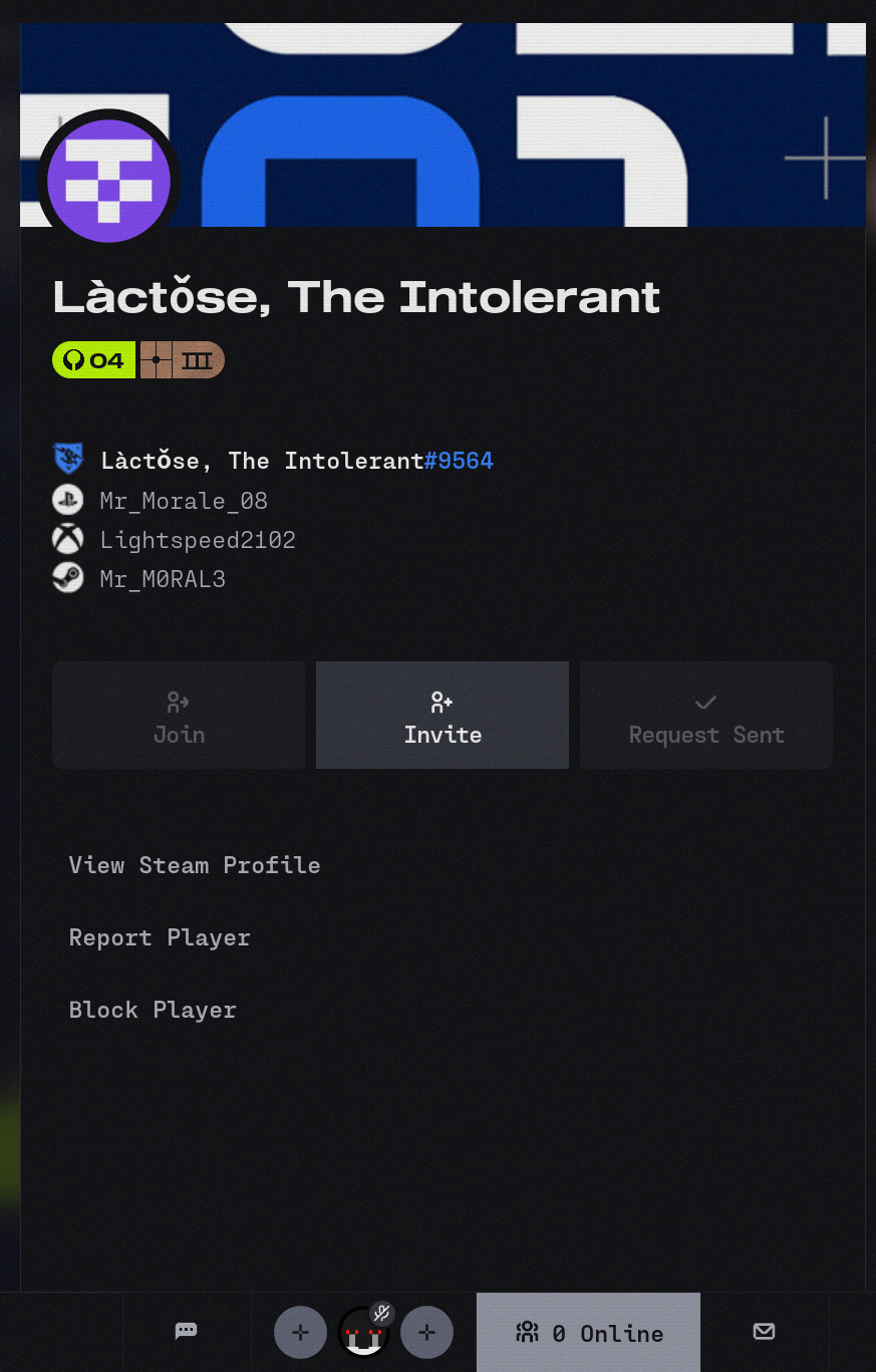 • This is also my view of his profile, unable to join him and a pending friend request. I've also tried repeatedly to friend him on externals like steam, playstation, and on the bungie website.