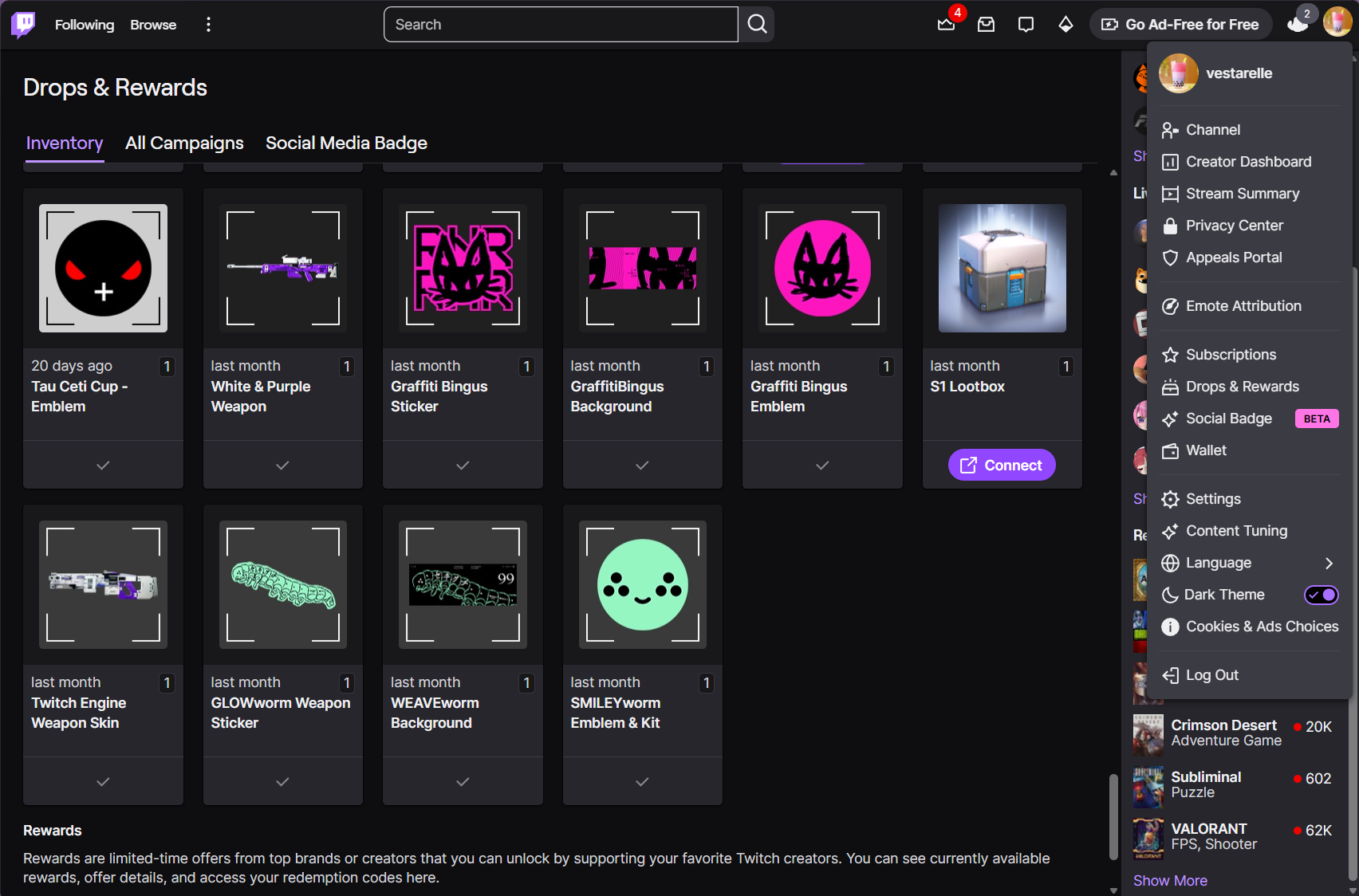 Posting this since I've seen other people have success in doing the same. It's been a month since I've claimed server slam Twitch rewards and I've received everything except the WEAVEworm background. My account names and twitch page is below. I'm hoping we can get the WEAVEworm background into my game. Thank you!