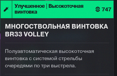 The BR33 Volley Rifle is translated as "Multi-Barrel Rifle (Многоствольная Винтовка)" in the Russian localization, based on the historic meaning of the word "Volley" in this context to mean weapons with multiple barrels which discharge in quick succession. This is incorrect; a more appropriate translation would be "Винтовка Серийного Огня (Burst Fire Rifle)" or similar.