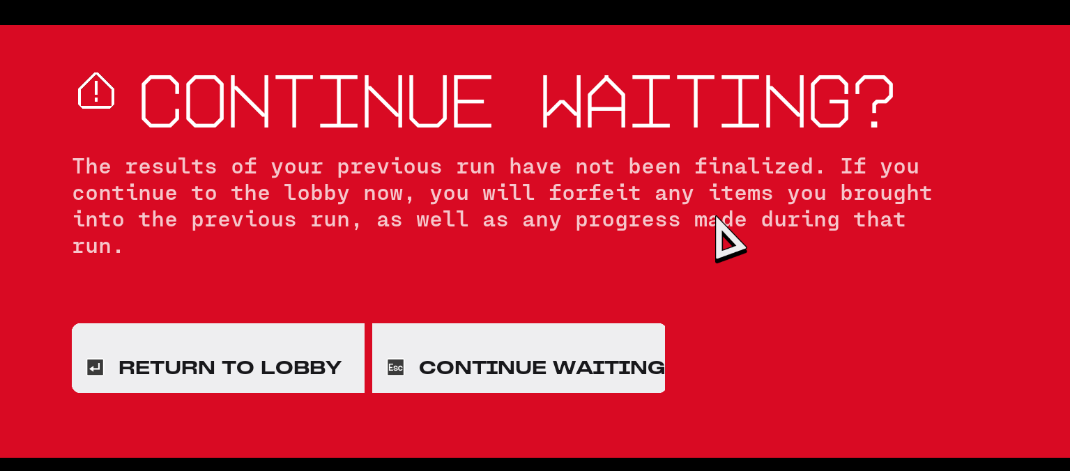 I continued waiting on the black screen when prompted but was unable to reconnect. Eventually I alt-f4'd the game and relaunched to see if I could reconnect. After progressing through the intros I waited on a black screen until the same "continue waiting" prompt appeared and was never able to reconnect.
