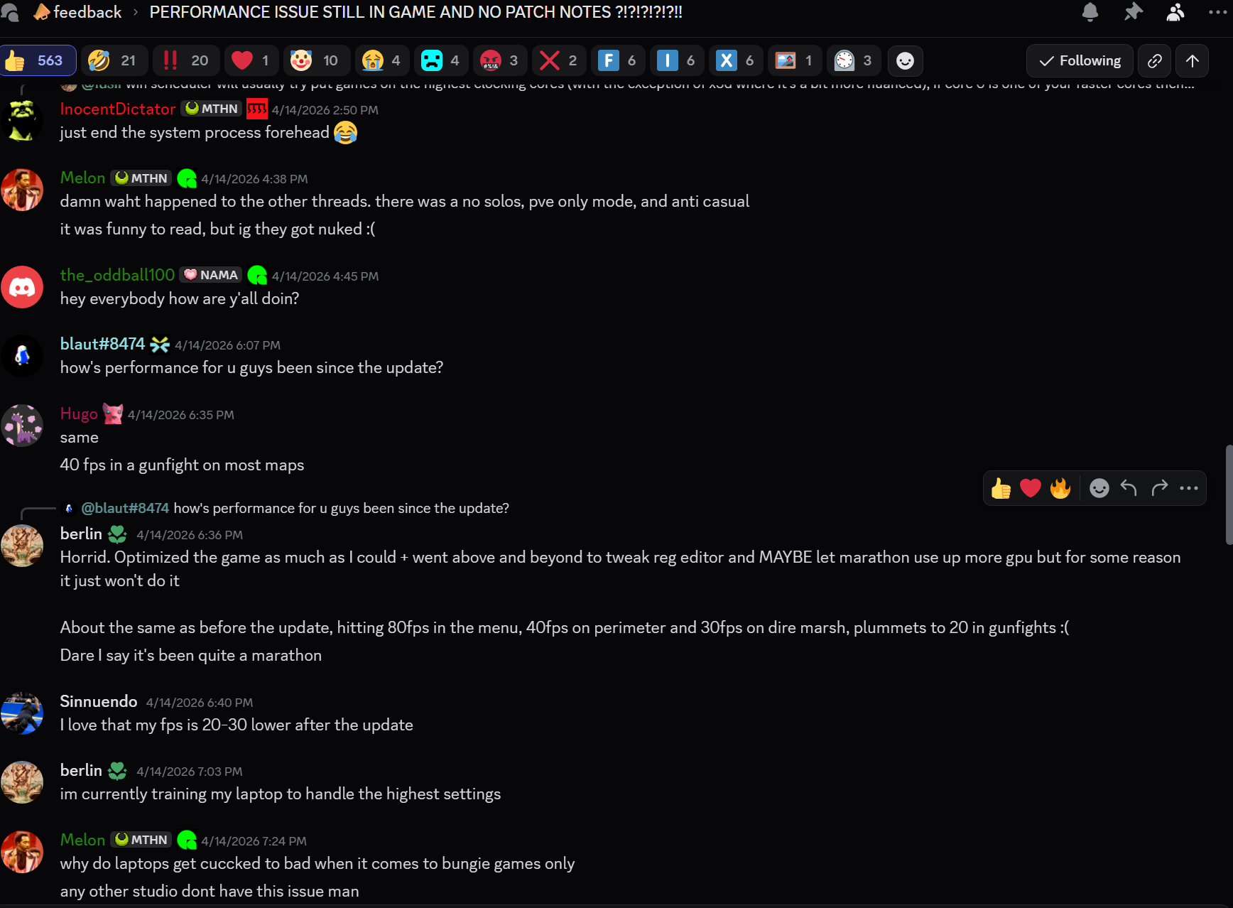 The Discord is a black hole. When we post here, we’re told to go to the Discord. But in the "Runner Chatter" feedback section, the single most active thread now with over 600+ reactions is titled verbatim "PERFORMANCE ISSUE STILL IN GAME AND NO PATCH NOTES ?!?!?!?!?!"