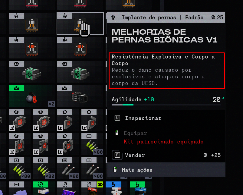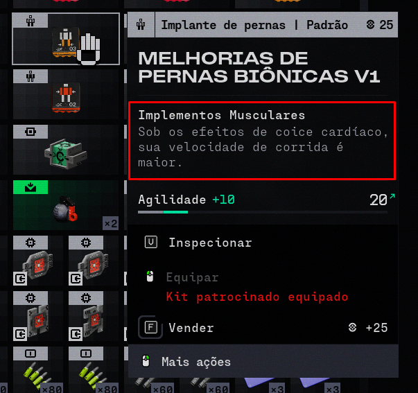 Which one is the effect of Bionic Legs V1? It needs to be the same or clearer on the item title. Also, all the implants should have different icons. If we are able to change it in run, it needs to be recognizable faster.