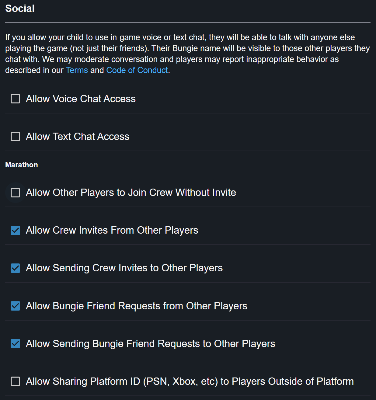 I've gone through the trouble of making and linking my son's Bungie account to mine and I've updated his permissions on the web page, but it's not allowing me to update any of the restrictions on his profile in game. I've checked all the boxes I wanted to for his account (see below) and nothing has changed.