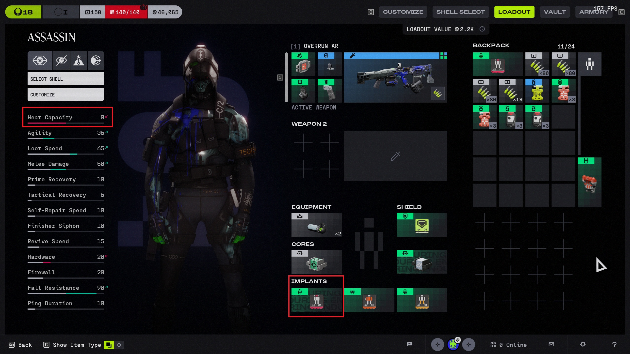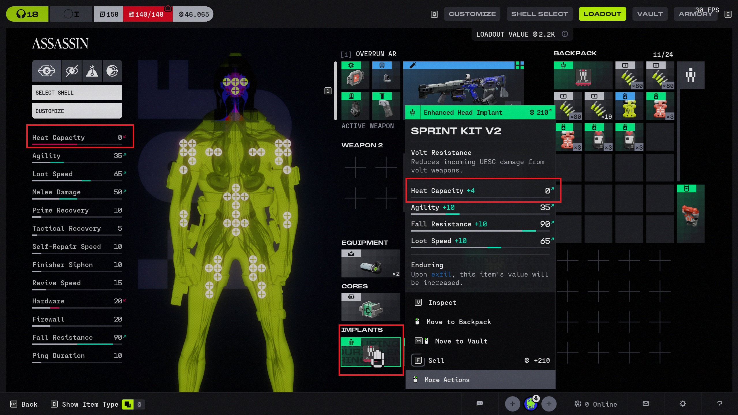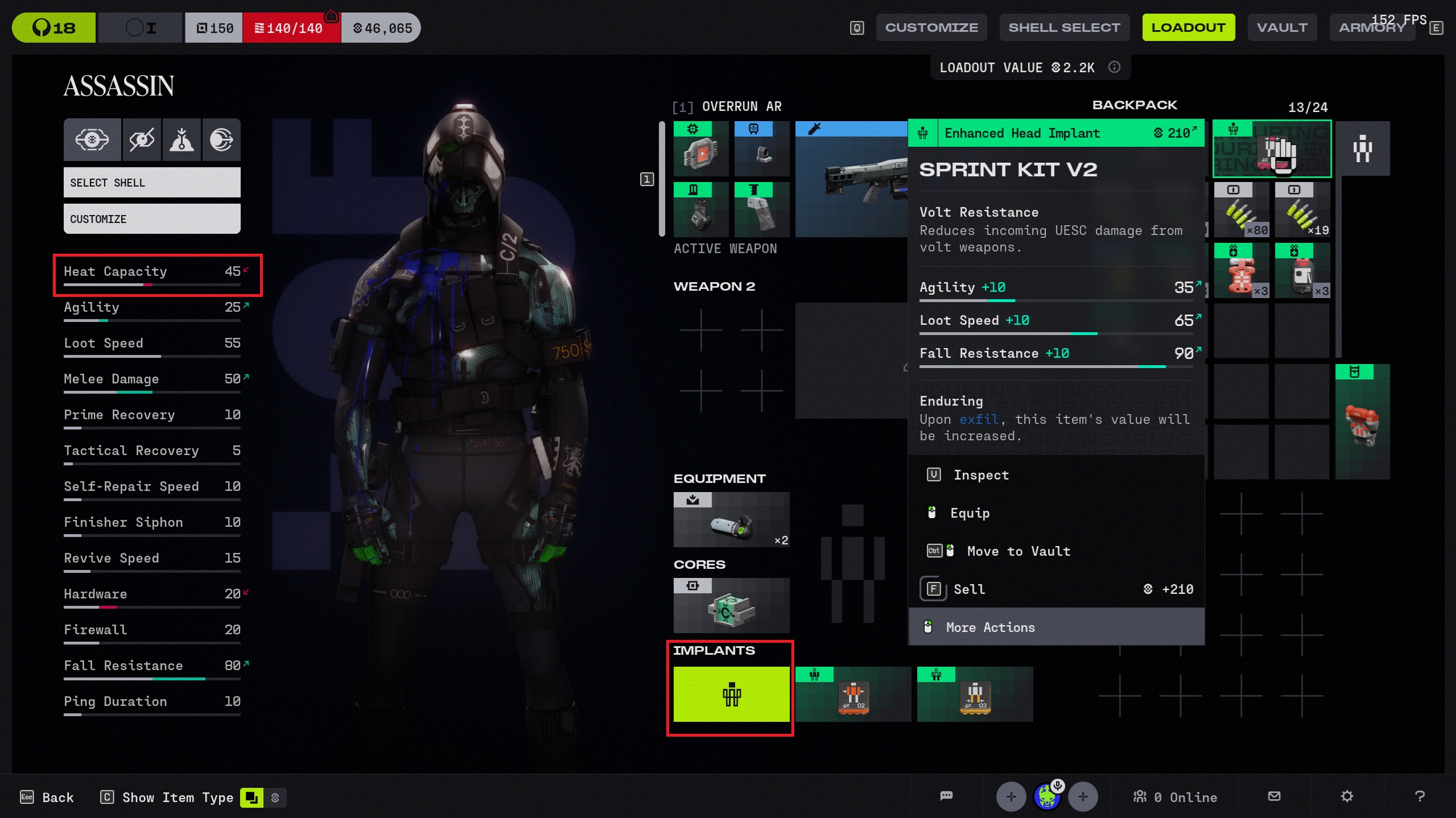 When I equip a "Sprint kit V2" head implant and a "green shield V1" equipped my heat capacity stat drops down to 0. Tested on two different clients/users. Not sure if this is just a menu UI bug or it's actually dropping my heat capacity to 0 in-game.
