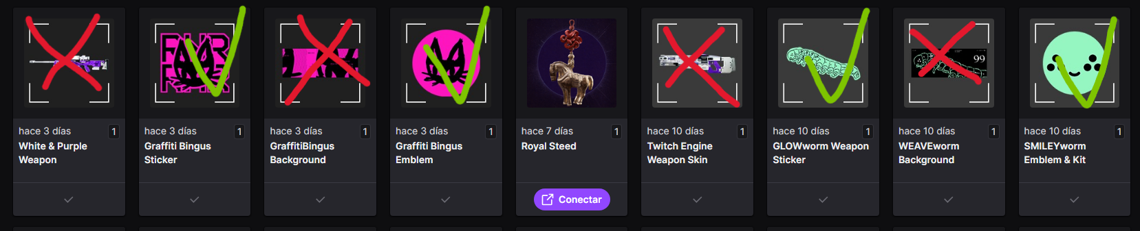 After several disconnections and reconnections between Twitch and Bungie accounts. After restarting the game, restarting Steam, etc., the Twitch drops with the red cross are still not appearing. It's really frustrating. It's as if they're giving them out drop by drop.