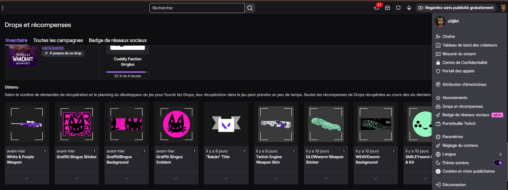 Some Twitch drop rewards have not been distributed to my account. Here are the ones I have not received: White & Purple weapon, GraffitiBingus background, Twitch engine weapon skin, and WEAVEworm Background.