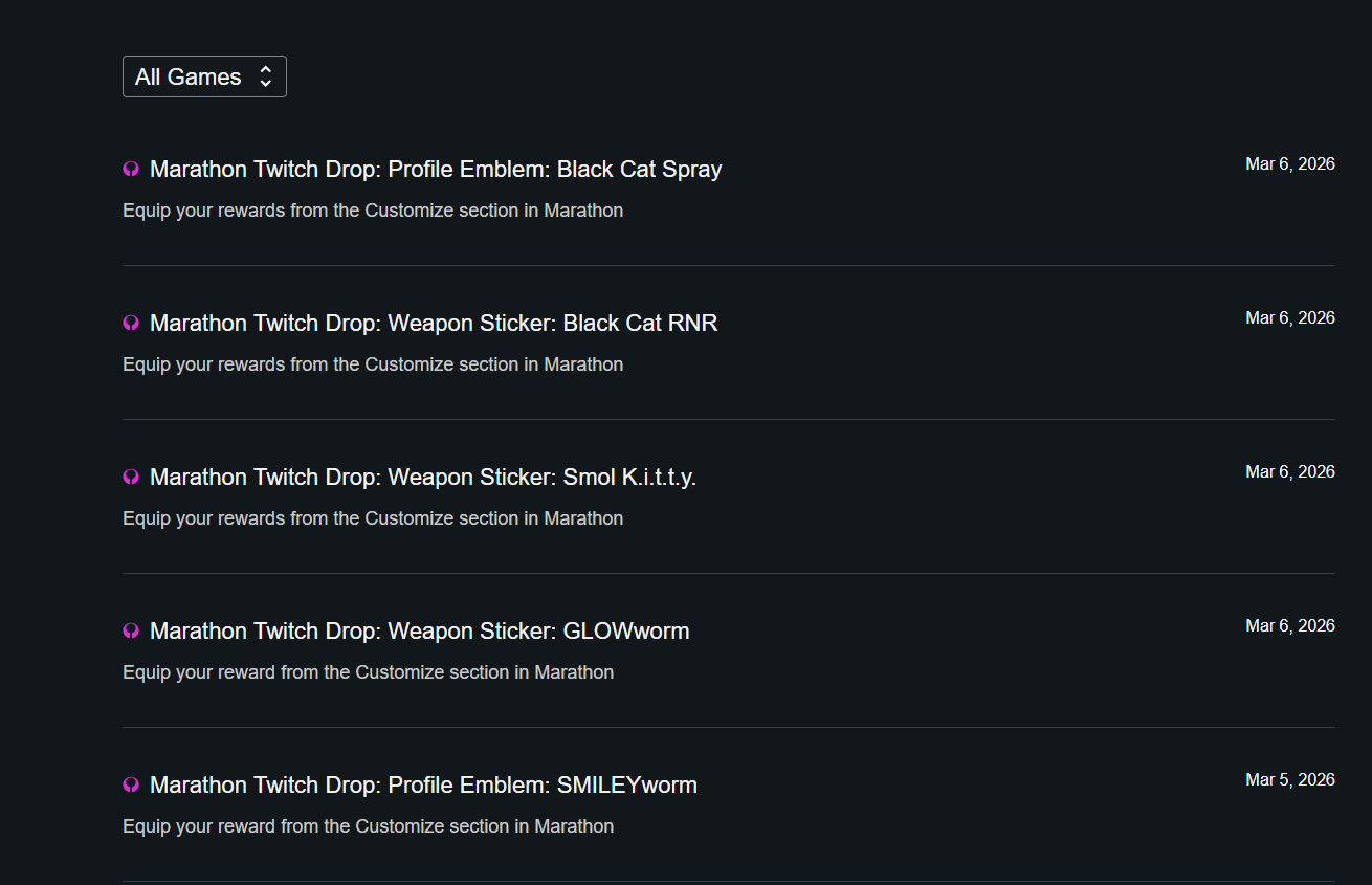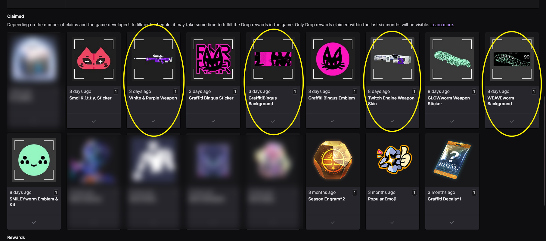 Below is my Twitch Drops inventory page(missing items are circled in yellow):