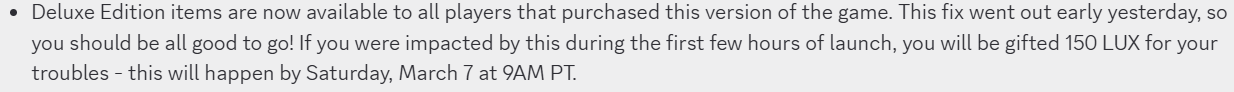 We understand that you didn't receive the 150 lux gift. Our records show you began playing on March 6th, after the bug for which this lux was sent out was fixed. We hope that this clarifies why your account did not qualify for this lux.