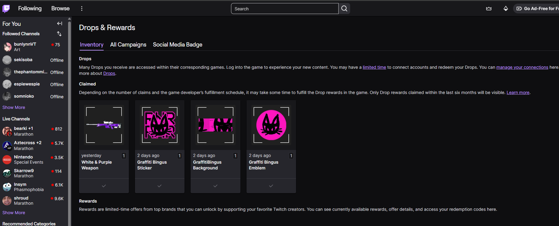 Hello, I have not yet received the graffiti bingus emblem even after claiming it via twitch inventory. Attached are screen shots of my partner rewards as well as my twitch inventory.