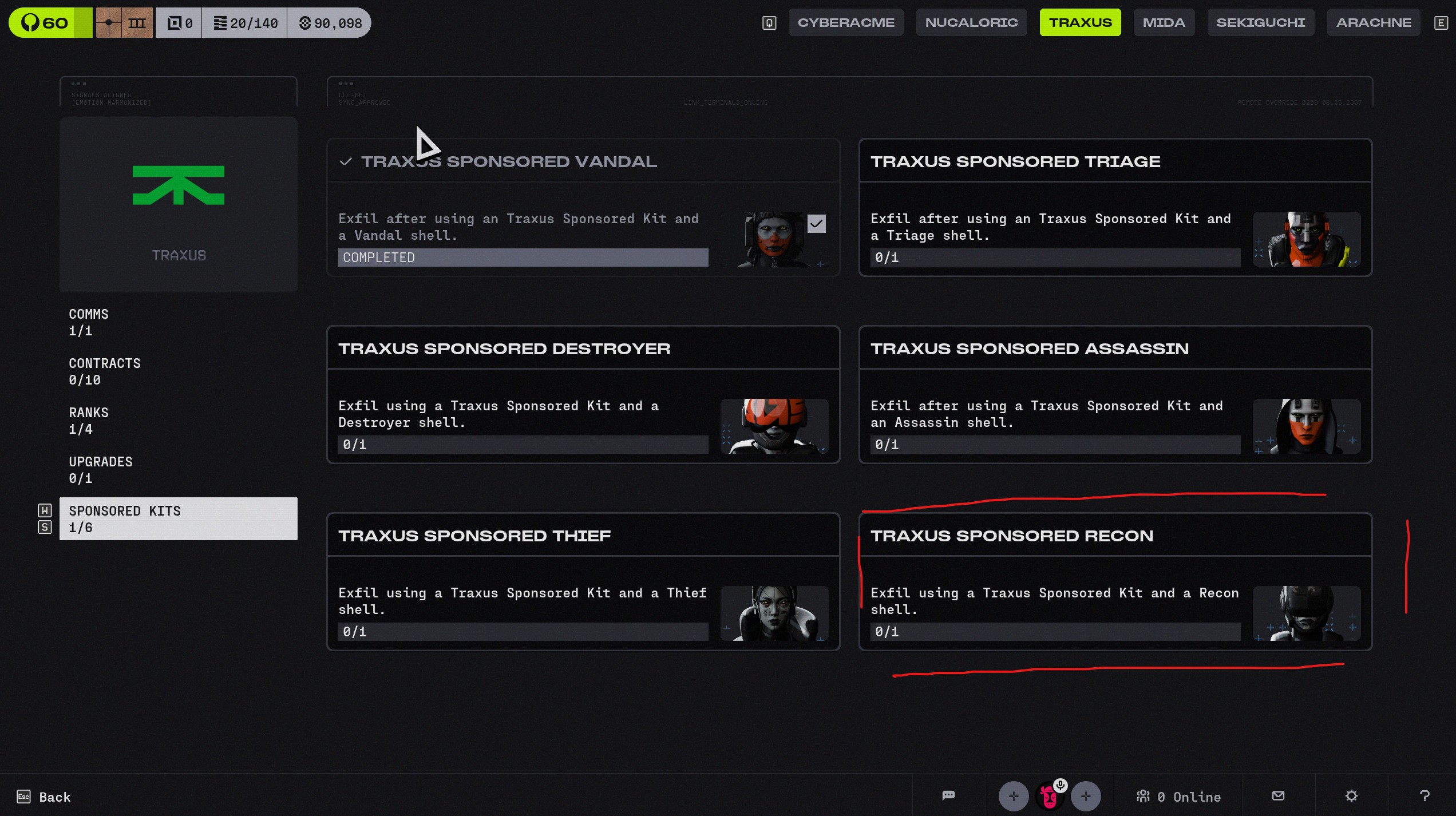 Hello, I was on Recon, I did a run with the sponsored kit, had a pretty good run, I left with blue shield green backpack and some ok weapons, when I left I basically did not have any thing left from the sponsor kit besides some ammo, maybe thats why? but my recon skin for Traxus did not unlock and the Codex entry is still 0/1