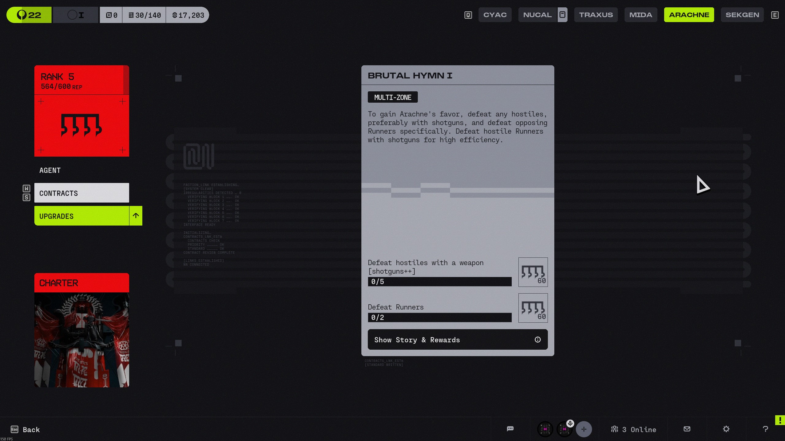 • Description of Issue - After completing all NuCaloric and Traxus primary contracts, I went to continue on to Mida and Arachne and noticed the primary contracts that used to be there disappeared. Only contracts available now are standard contracts. Not sure if this is intended but making my progress to level 30 and faction rep grind very slow, can only grind standard contracts.