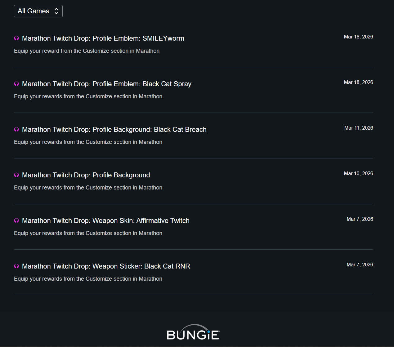 Also, I don't suppose you can shed any light on what the Marathon Twitch Drop: Profile Background one is meant to be? Whatever it is I don't have it in my account, the only profile background I've ever received from Twitch drops is the Black Cat Breach one.