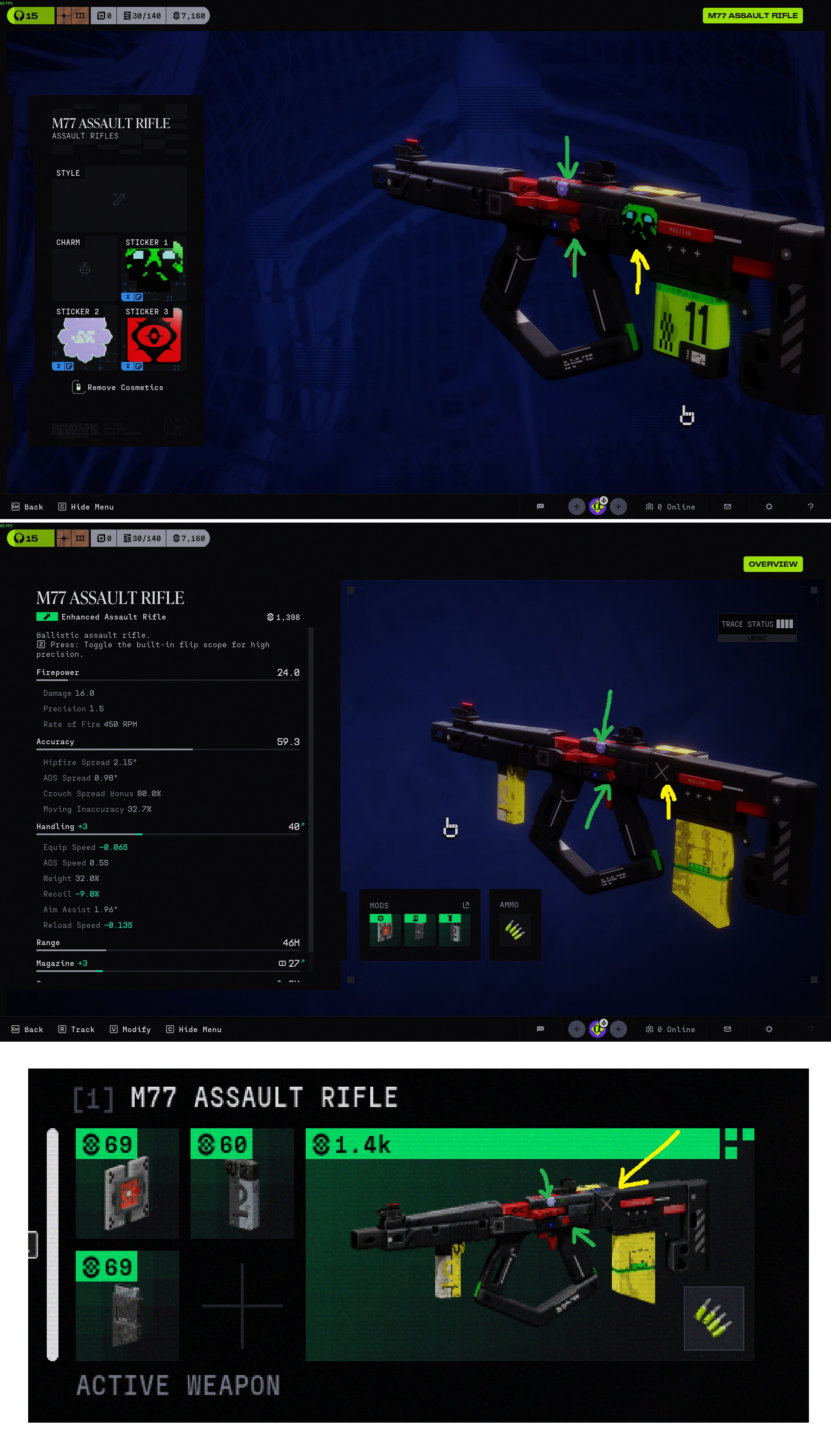 - Description of Issue: Weapon: M77. ‘Sticker 1’ (yellow arrow) was missing in the weapon modifying menu and in the vault/loadout menu, but was visible in the customization menu. Removing weapon mods didn’t fix this issue. I can’t tell if the problem would be visible in a run, because reapplying the sticker, going back to the armory, and applying it again fixed this problem. Other stickers were visible just fine (green arrows).