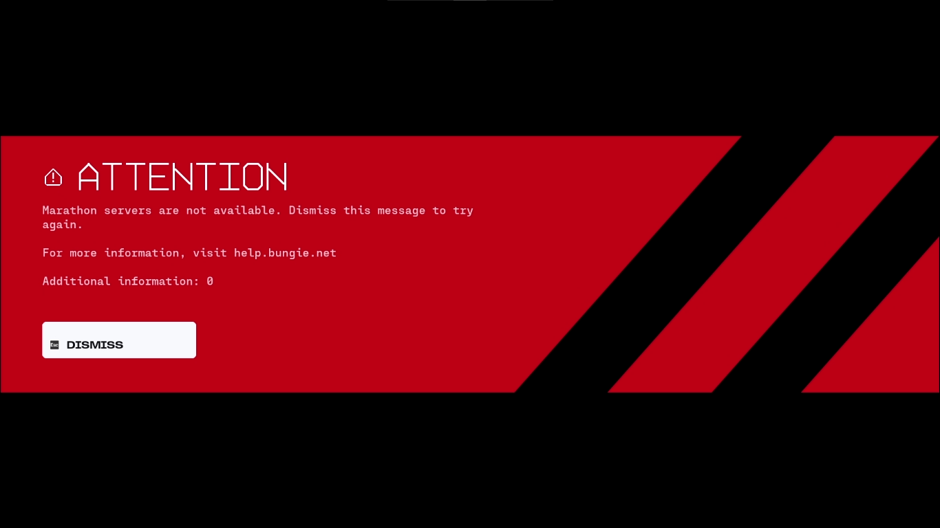Marathon Servers are not available, Dismiss this message to try again. For more information, visit help.bungie.net Additional information: 0