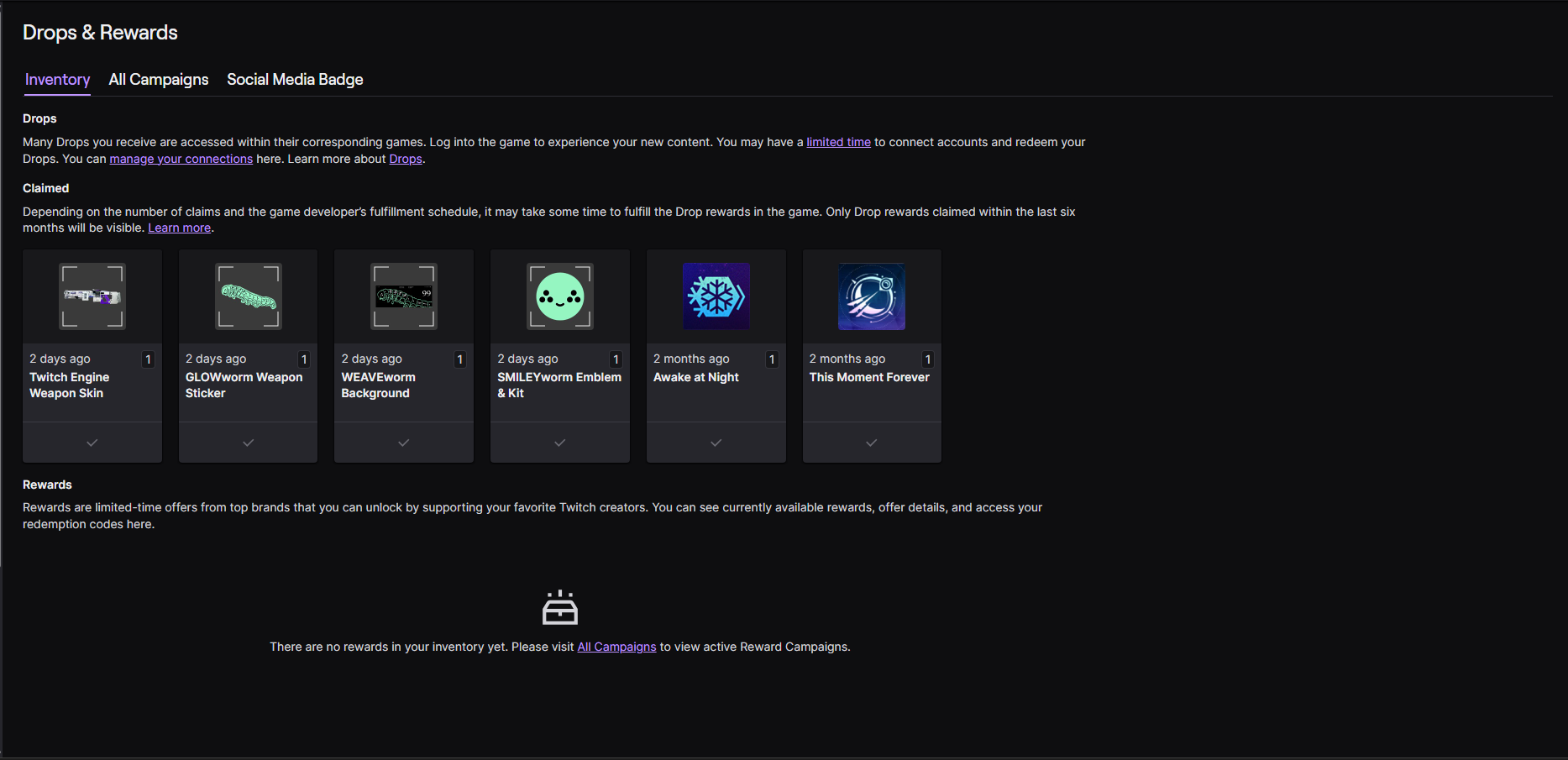 That's basically it. I noticed they added an option to filter by game, I filtered by "Marathon" and it says "No Results Found". I don't really know if it is intended behavior since the drops are to be delivered on the full release of the game or if it's something on my end. I double-checked that my Twitch account is linked with my Bungie account, and I claimed the drops 2 days ago, I'll attach some images if it helps in some way.