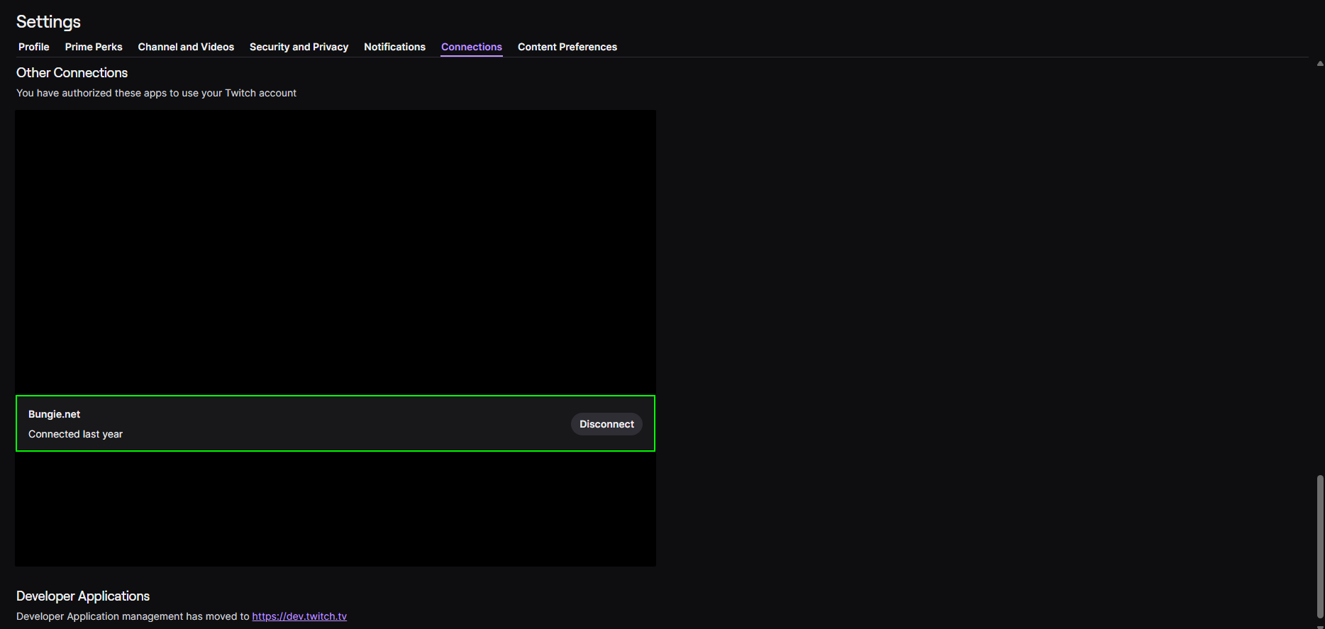 2. Bungie.net connected in Twitch's Connections tab. (for obvious security and privacy reasons my other connections are redacted)