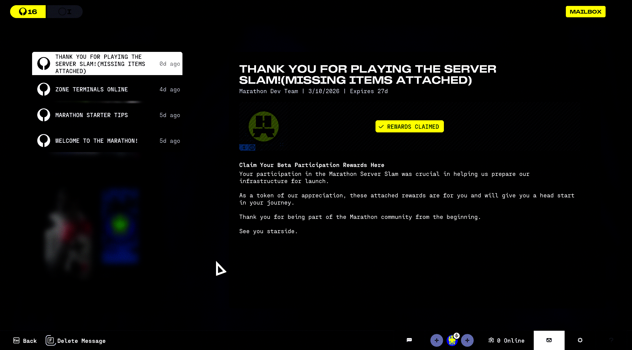 There is no option to claim the server slam rewards. I can see the items in mail, but there is no way to accept them. My friend was able to claim on their account, but no luck here!