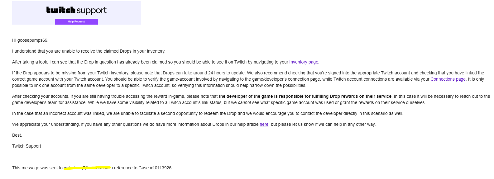 If you have already gone through the steps in our Twitch Drops guide, please share screenshots of your Twitch Drops & Rewards Inventory and let us know exactly which drops have not been received in-game.