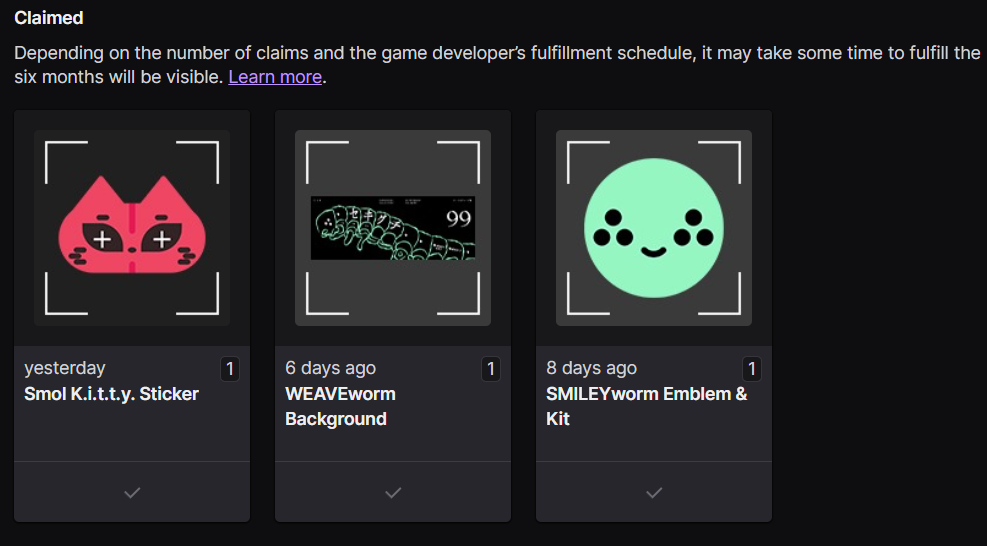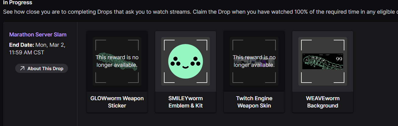 After the game launched, I noticed that I was already eligible to get the "WEAVEworm Background" from the server slam twitch drops. I already claimed the first one beforehand and when I claimed this one, it does not show up in game even though it's confirmed on twitch. I have tried unlinking and relinking accounts but it has still not worked. I claimed a different item I was eligible around the same time and that one I was about to get. Here are the images to confirm it.