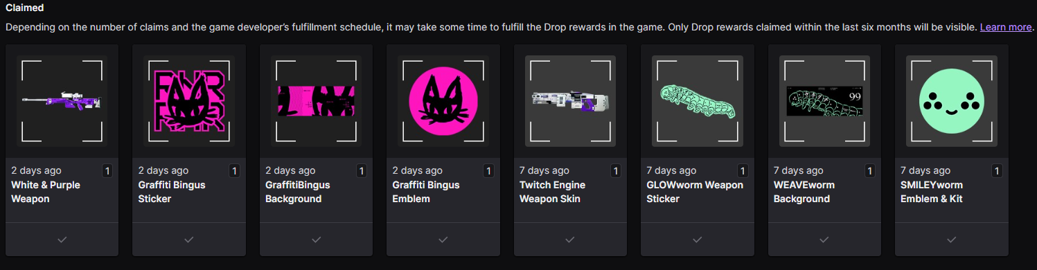 I have only received Graffiti Bingus Emblem, and Graffiti Bingus Sticker even though I have completed and collected all the drops. Twitch support says to contact you.