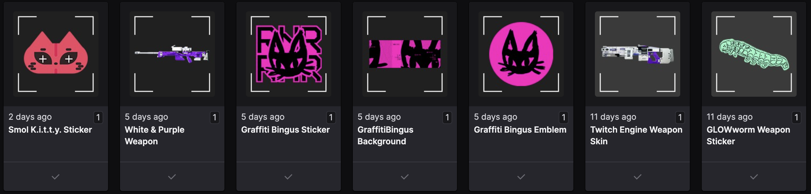 Previously post about missing Twitch Drops. Logged in today and received the Graffiti Bingus Background. Still missing 5 drops: Graffiti Bingus Emblem, Twitch Engine Weapon Skin, Glow Worm Weapon Sticker, Weave Worm Background and the Smiley Worm Emblem and Kit.