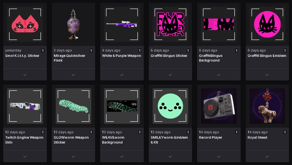 I'm still missing ALL 9 twitch drop rewards to include the gifted sub reward and launch rewards. Its been 13 days for some rewards since claimed and still nothing, which is a bummer because I enjoy the game and collecting cosmetics as a whole. As someone who pre-ordered deluxe edition and genuinely hopes the game thrives, It's a bummer to see issues such as this. If BSG can make tarkov drops work, with how notoriously sloppy their team is. surely Bungi can figure this out.