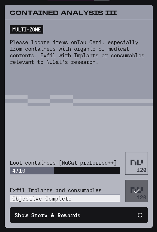 The "Exfil Implants and consumables" objective for repeatable quest "CONTAINED ANALYSIS III" is being completed even without being exfil'd