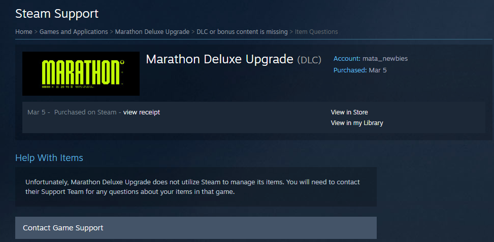 I've already read your Accessing and Restoring Licenses guide and done everything it said. I have the game in my library, I have the DLCs and they are installed. My Steam purchase history shows that I acquired the products, but when I open their support page it tells me to contact you, Bungie support.