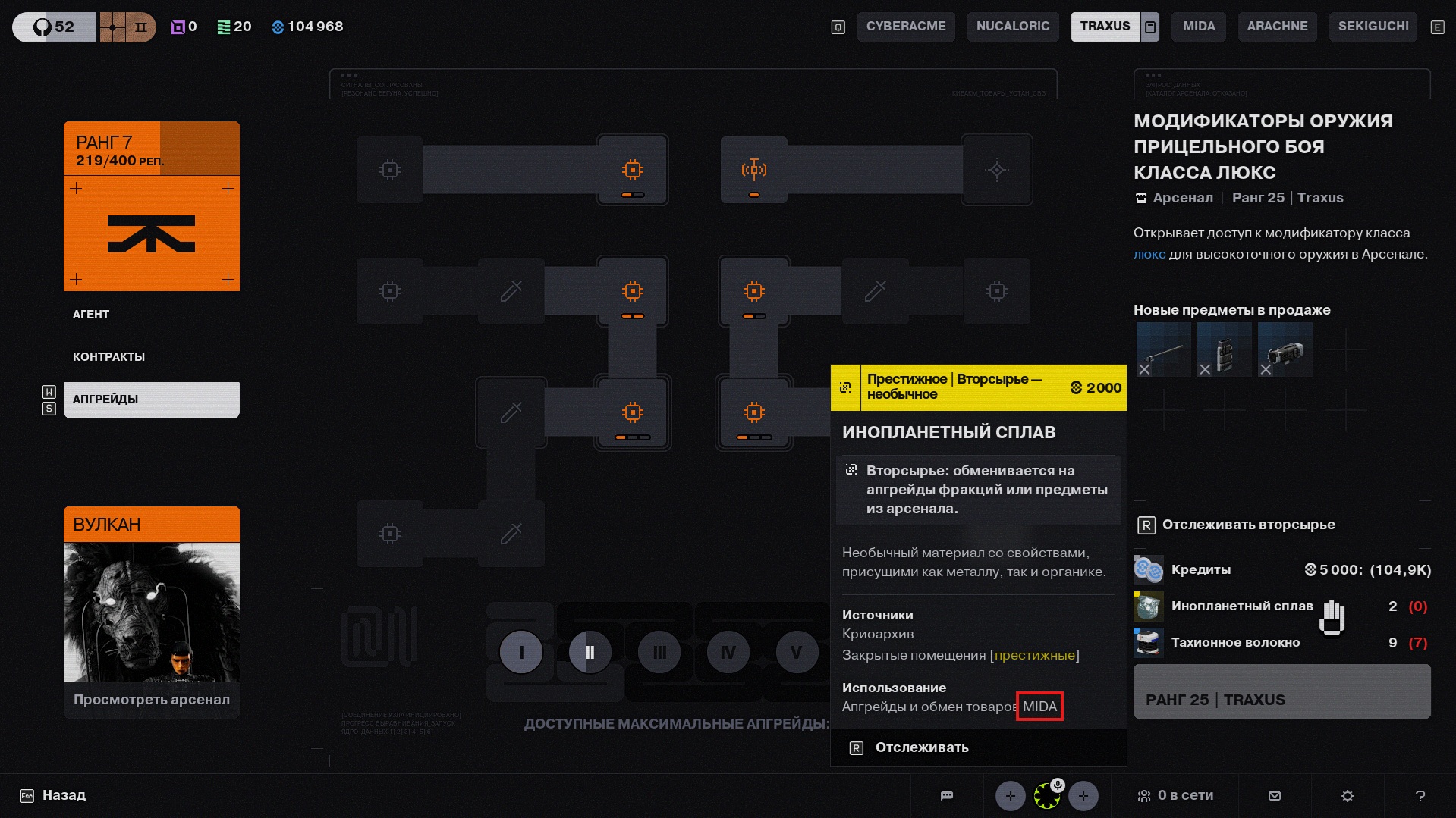 On the screenshot Alien Alloy used for MIDA upgrades, but Traxus also use this material for upgrades