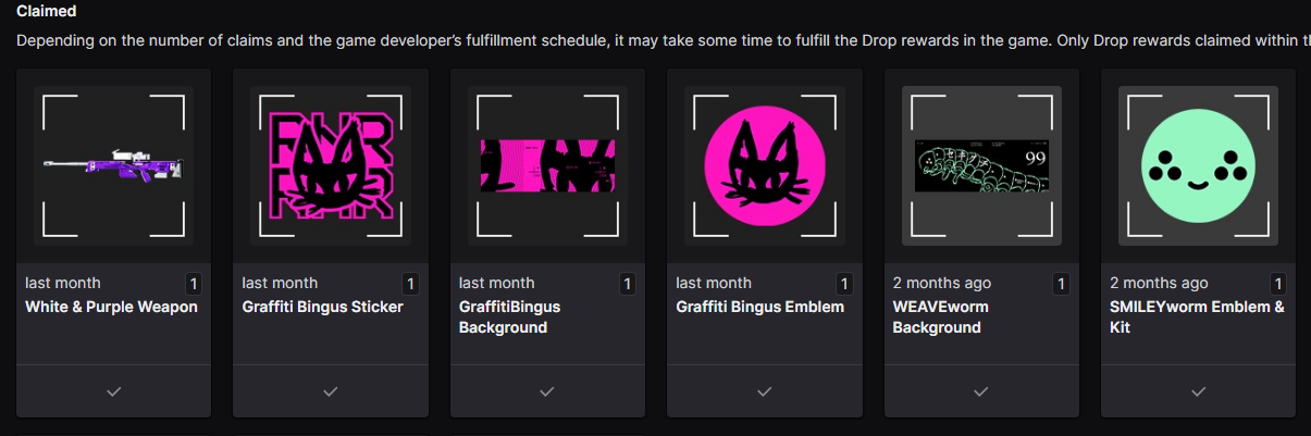 Thank you very much for reaching out to us. I'm sorry to hear that you are missing some of the twitch drops. To help us investigate further, can you provide us with a detailed list of the drops you are missing?