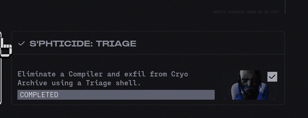 So i spent the weekend grinding all 7 cyac challenges for all 7 challenges for vidmaster. My team launched a run with 8 minutes left before reset. We completed the run, with lvl 5 clearance, compiler kill, and my last challenge was for killing 200 UESC puppets and looting 1 compiler ganglion. Upon clearing the run because it ran through reset I was not able to turn in my challenge. Im frustrated because I did the work to clear all 7 challenges and took it down to the wire but even though I completed the challenge in my run I cant even turn it in at reset. Is there any way to complete the challenge to update my codex at this point or am I going to have to complete all 7 challenges and a compiler kill again? I dont stream or anything so all I can do is share a screen shot of my inventory with the 2 ganglions. The screenshot showing my 6/7 challenges completed and my character with the skin on it. Please let me know. This is by far the hardest challenge for vidmaster so its heartbreaking to think about doing it again when ive done probably 40 runs this weekend to get that done.