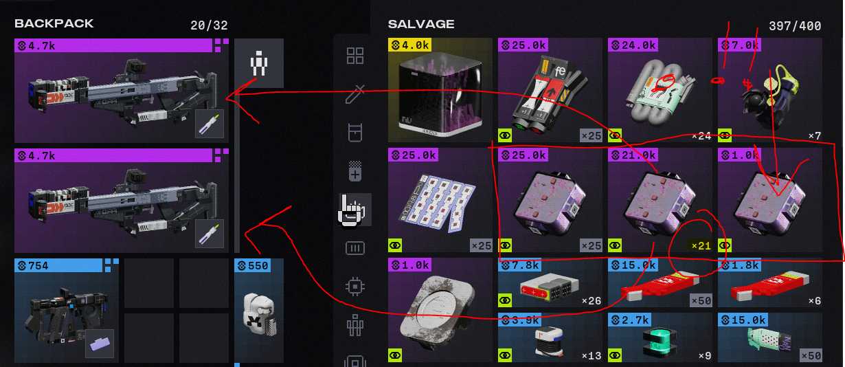 When purchasing items in the armory for salvage, sometimes multiple stacks of salvage will not "collapse" as expected.